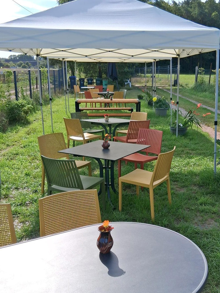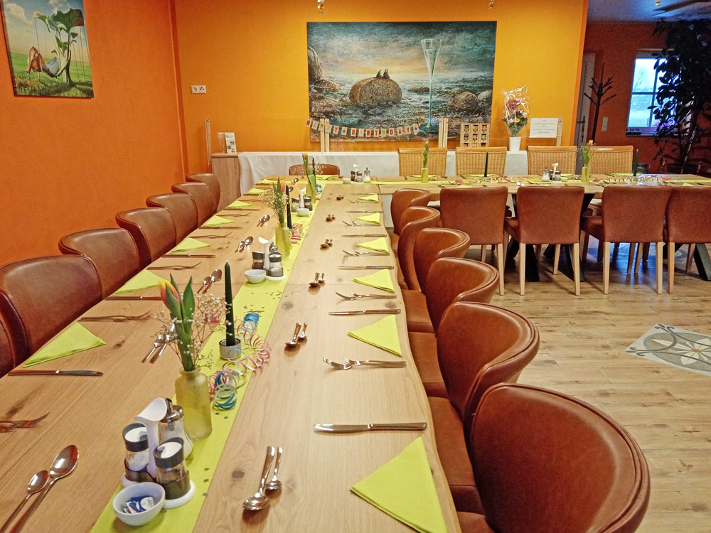 Unser gemütlicher, barrierefreier Gastraum lädt zum Verweilen ein. Familien- und Firmenfeiern sind im Innenbereich bis zu 24 Personen möglich, größere Gruppen empfangen wir gerne in unserem naturnahen Außenbereich mit Spielplatz. Parkmöglichkeiten sind selbstverständlich vorhanden.